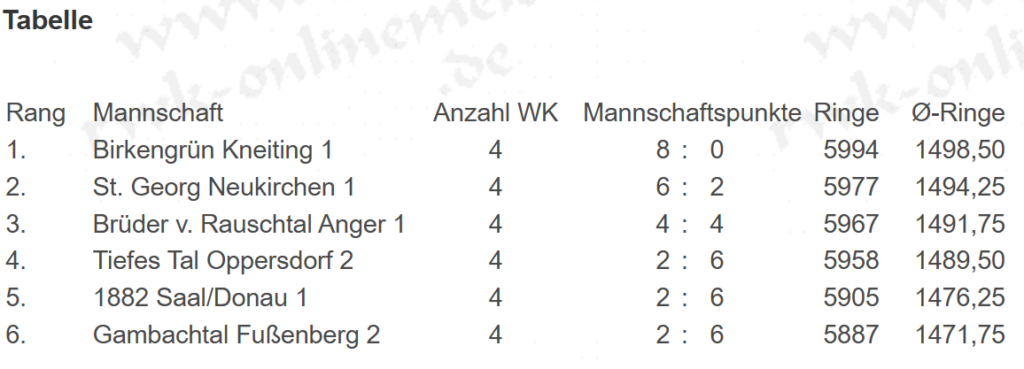 Mit einem knappen 1489 zu 1488 holt die 2. Mannschaft Luftgewehr den 1. Sieg in der Bezirksliga. Es bleibt zwar bei Platz 6, aber der Anschluss ist wieder hergestellt.