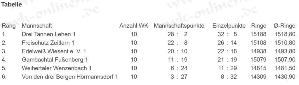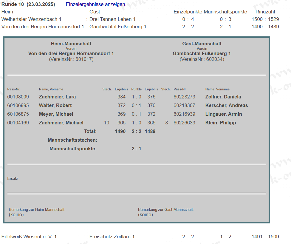 Im letzten Durchgang der Saison kassieren wir nochmal ein 2:2 gegen Hörmannsdorf. Leider reicht es auch nach Ringen mit 1489 zu 1490 ganz knapp nicht für uns, so dass wir nur einen Punkt mit Heim nehmen.