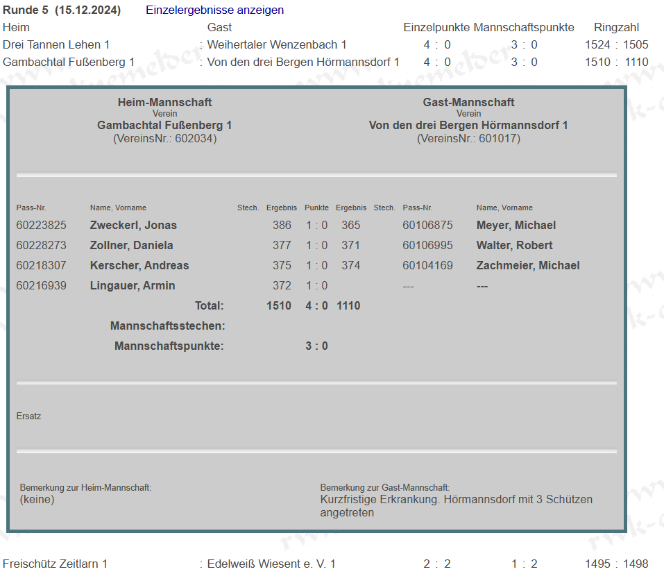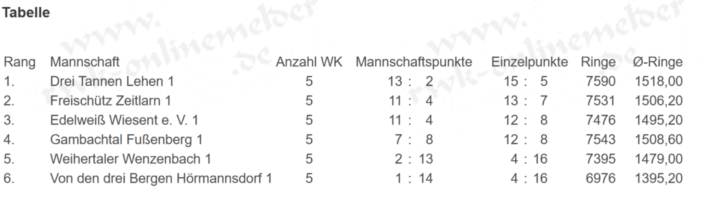 Zum Abschluss der Vorrunde gewinnt die 1. Mannschaft Luftgewehr mit 4:0 Punkten gegen Hörmannsdorf, die krankheitsbedingt nicht vollzählig antreten konnten.