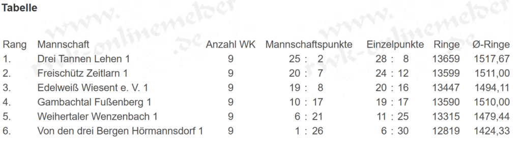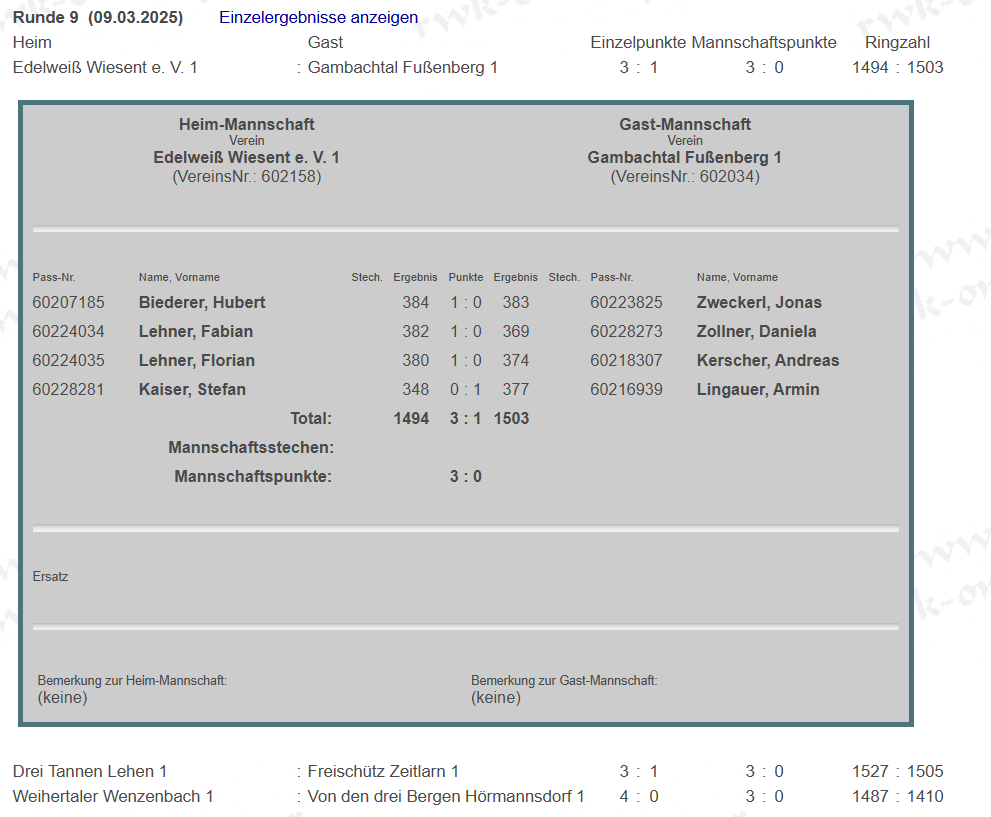Im vorletzten Durchgang gab es für uns nochmal eine Niederlage. Mit 1:3 Punkten verlieren wir in Wiesent. Das Endergebnis der Tabelle steht damit eine Runde vor Ende für uns bereits fest. Wir werden die Saison als 4. beenden.