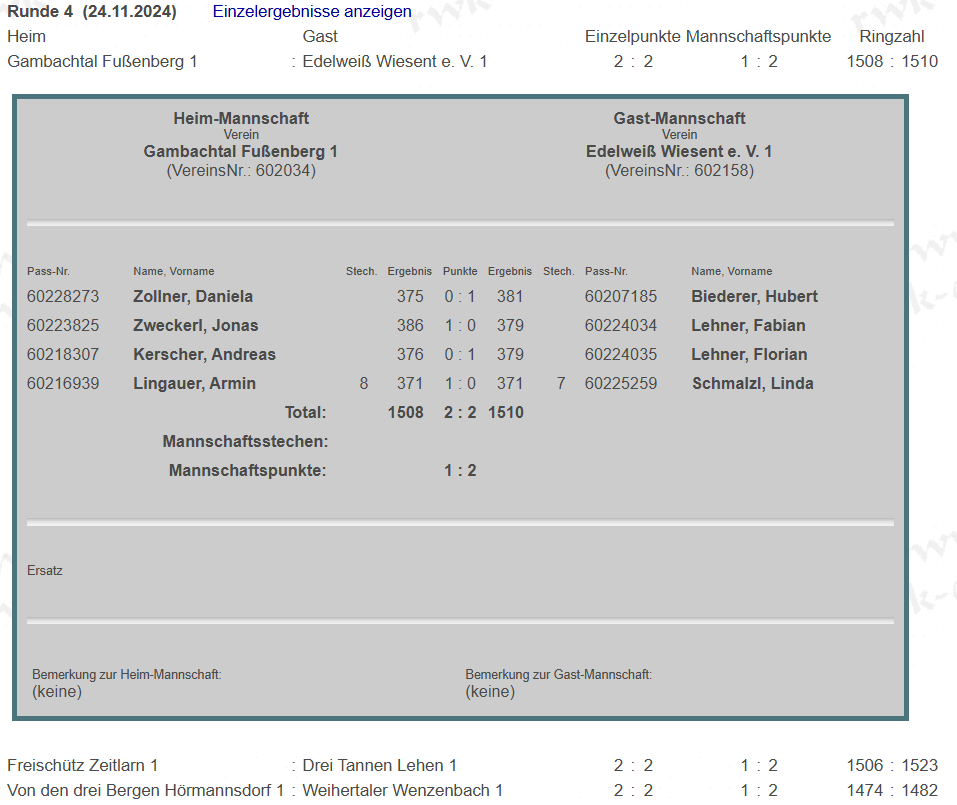 Im Heimkampf gegen Wiesent können wir zwei Einzelpunkte holen. Leider verlieren wir nach Ringen knapp. Somit geht 1 Punkt an uns und 2 nach Wiesent.
