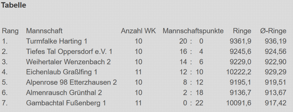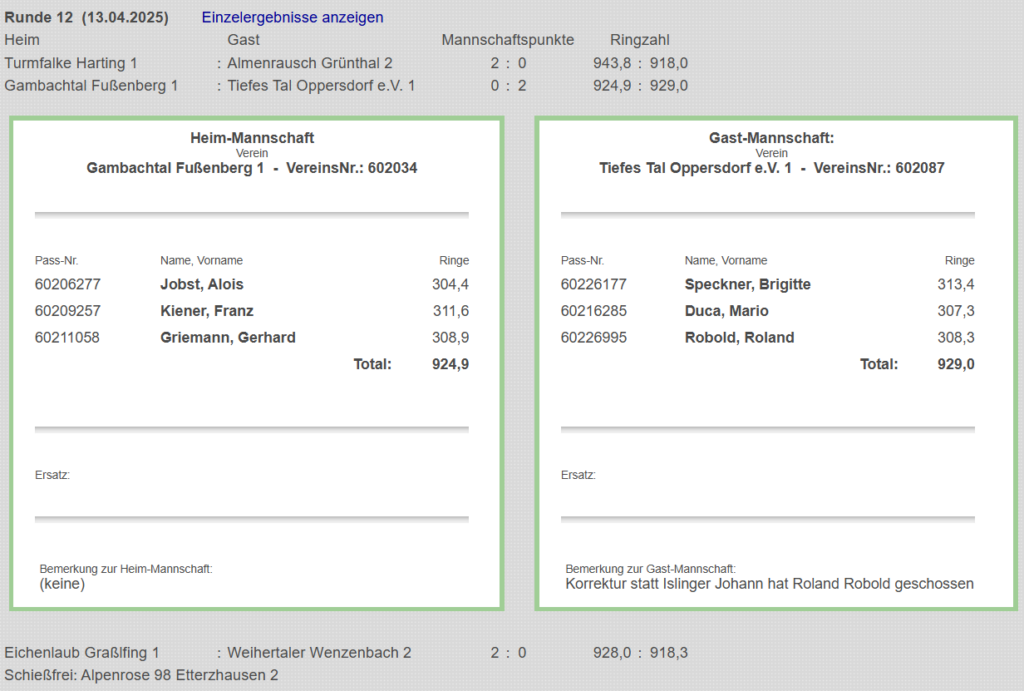 Trotz guter Leistung verliert unsere 1. Mannschaft Auflage auch den 12. Durchgang. 924,9 zu 929,0 heißt es am Ende für Oppersdorf. Bei noch zwei verbleibenden Runden (davon 1 Aussetzer) wird die Luft schön langsam dünn.
