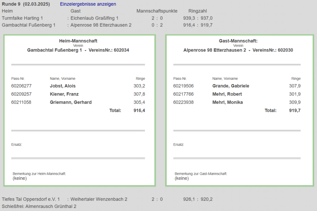 Auch im 9. Durchgang will es nicht mit dem 1. Sieg unserer Auflage 1 klappen. Daheim gegen Etterzhausen gibt es eine 916,4 zu 919,7 Niederlage. Wir grüßen weiter vom Tabellenende.