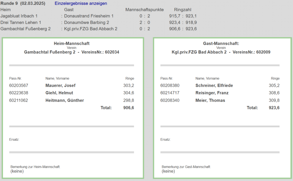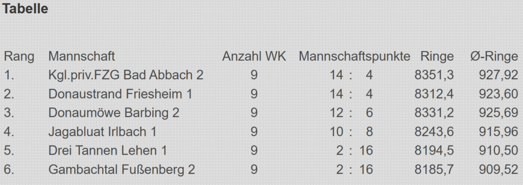 Durch die Niederlage unserer Auflage 2 gegen Bad Abbach mit 906,6 zu 923,6 Ringen und dem gleichzeitigen Sieg von Lehen in der Parallel-Begegnung rutschen wir auf den letzten Platz der Tabelle ab.