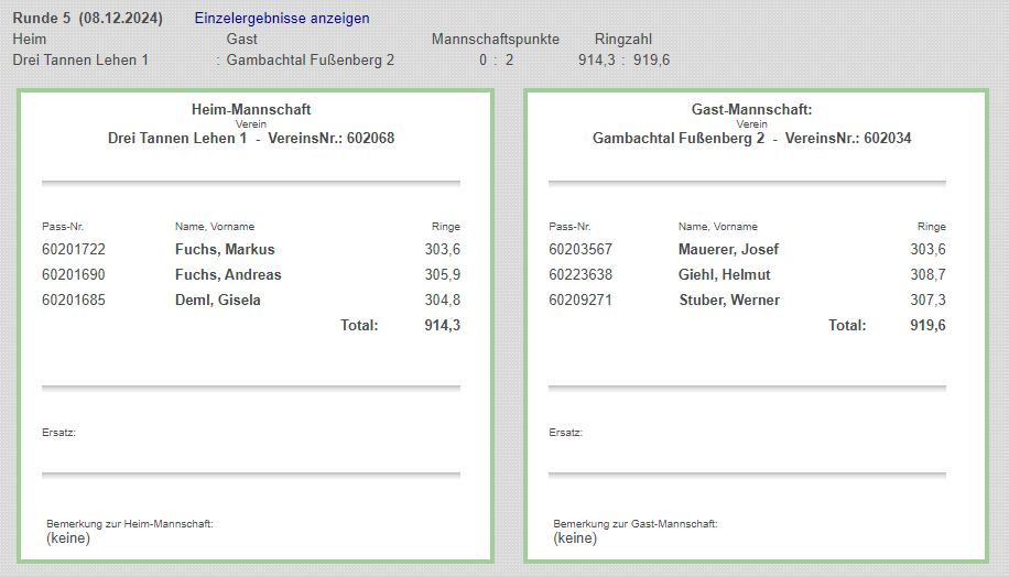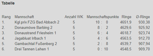 Im Kellerduell gegen Lehen konnte sich unsere 2. Mannschaft Auflage mit 919,6 zu 914,3 in Lehen durchsetzen und nimmt die ersten Punkte der Saison mit. Dadurch verbessern wir uns auf den vorletzten Platz.