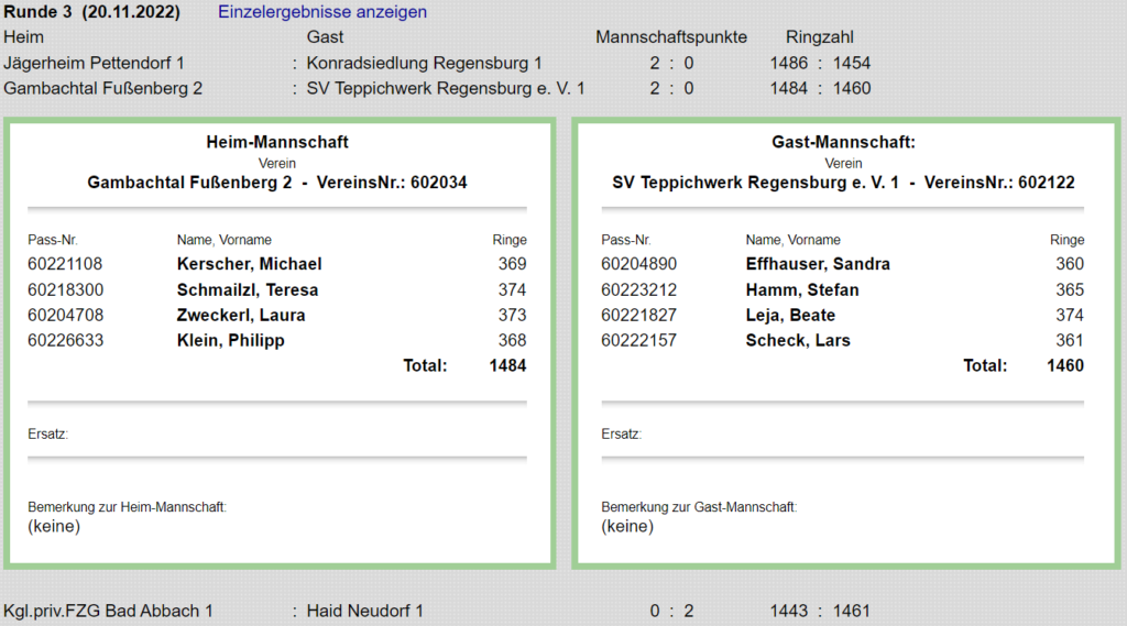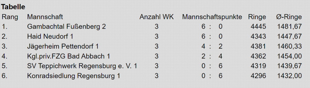 Die 2. Mannschaft Luftgewehr gewinnt auch ihren 3. Wettkampf diese Saison und kann auch ringmäßig wieder ein paar Ringe drauf legen. 1484 bedeuten 6:0 Punkte und Tabellenplatz 1.