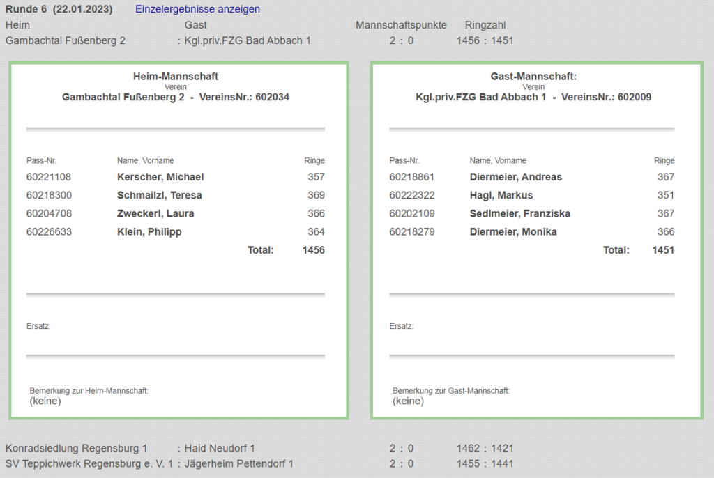 Unsere 2. Mannschaft Luftgewehr gewinnt daheim gegen Bad Abbach knapp mit 1456 zu 1451 Ringen. Durch die Niederlagen der Verfolger kann aber die Tabellenführung sogar ausgebaut werden.