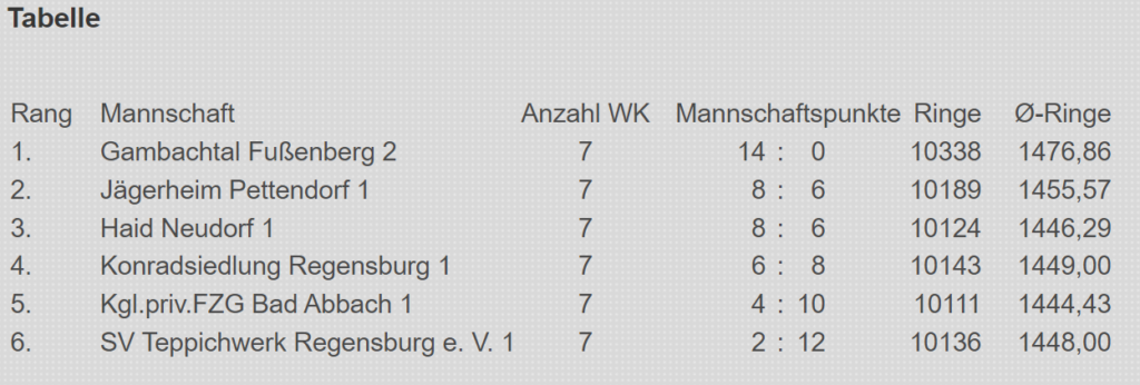 Die 2. Mannschaft Luftgewehr gewinnt auch den 7. Wettkampf in Folge und kann dadurch die Tabellenführung weiter ausbauen. Mit einem Schnitt von 1476,8 ist unserer Zweiten die Tabellenführung nur noch theoretisch zu nehmen.