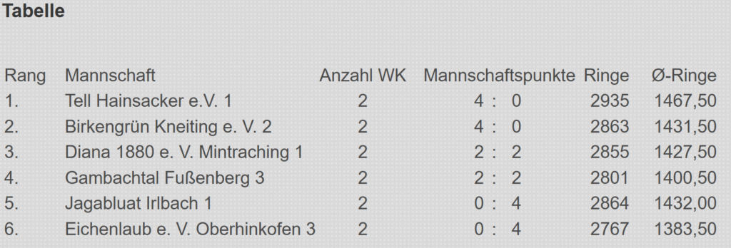 Die 3. Mannschaft Luftgewehr verliert daheim gegen Friesheim mit 1378 zu 1436. In der Tabelle heißt das Platz 4.