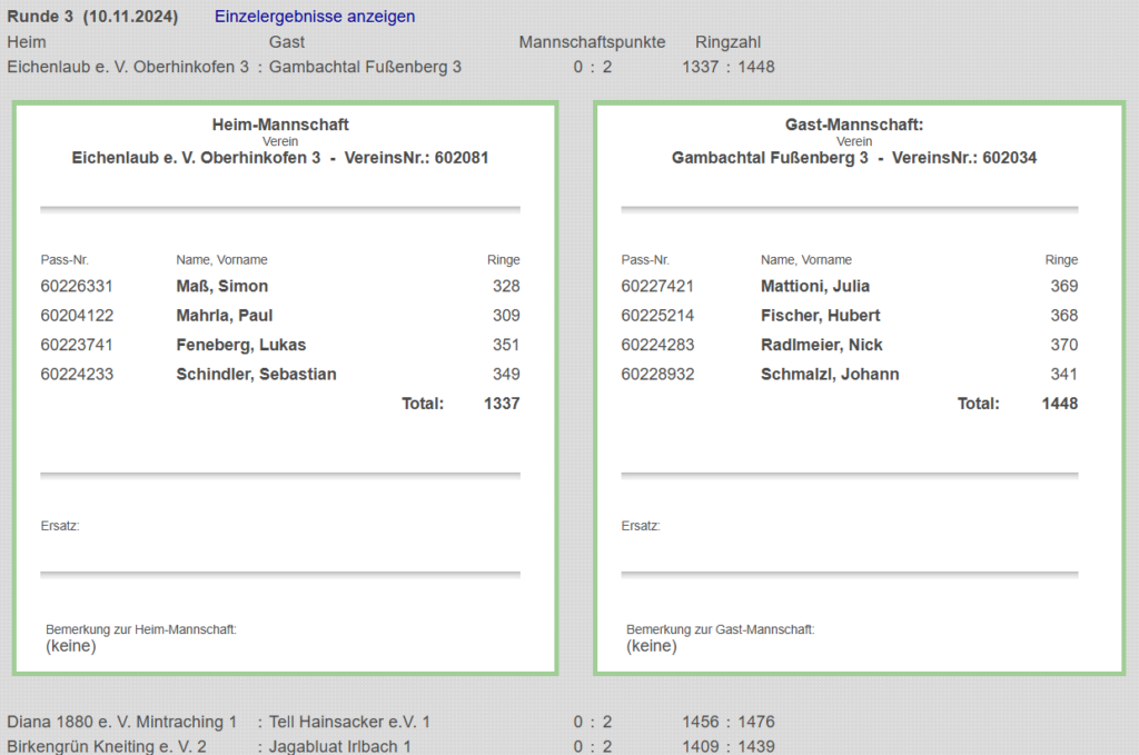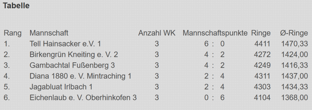 Mit 1448 zu 1337 holt die 3. Mannschaft Luftgewehr souverän ihren 2. Sieg in dieser Saison. Damit steht Tabellenplatz 3 zu Buche.