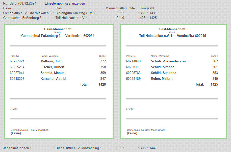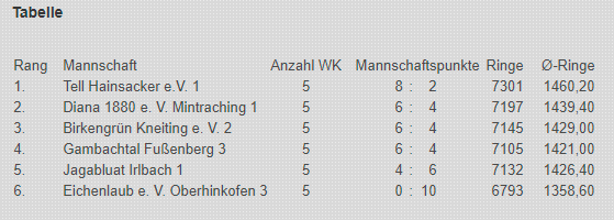 Die 3. Mannschaft Luftgewehr beendet die Hinrunde mit einem knappen Sieg gegen den Tabellenführer Heinsacker mit 1428 zu 1425. So bleibt man am Tabellenersten dran und verbessert sich in die Tabellenmitte, Punktgleich mit dem 2 und 3 Platzierten.
