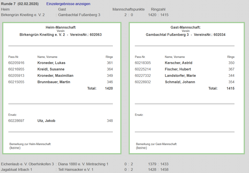 Im gesicherten Mittelfeld der Tabelle traf unsere 3. Mannschaft auf die Schützen von Kneiting 2 mit besserem Ende für die Gastgeber. Mit 1420 zu 1415 unterliegen wir knapp. In der Tabelle heißt das Platz 4