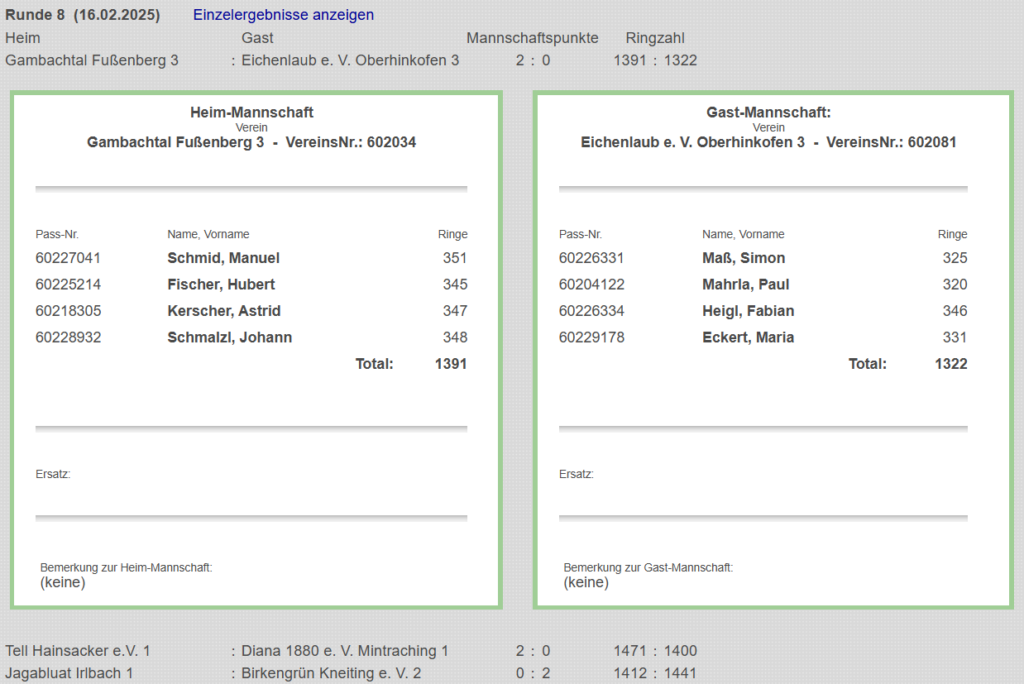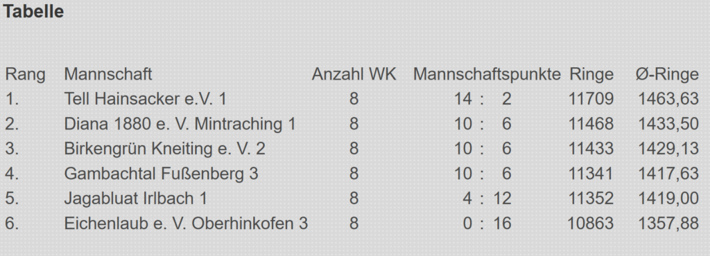 Die 3. Mannschaft Luftgewehr gewinnt daheim gegen Tabellenschlusslicht Oberhinkofen mit 1391 zu 1322 Ringen und verbleibt damit im gesicherten Tabellenmittelfeld.