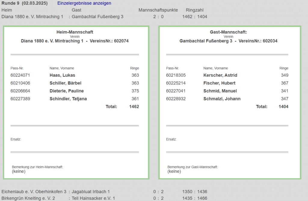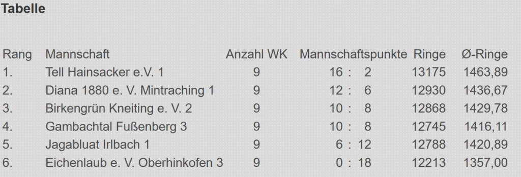 Die 3. Mannschaft Luftgewehr verliert in Mintraching mit 1462 zu 1404 Ringen. In der Tabelle befindet man sich weiter im gesicherten Mittelfeld auf Platz 4.