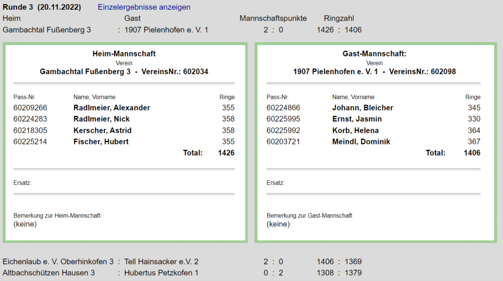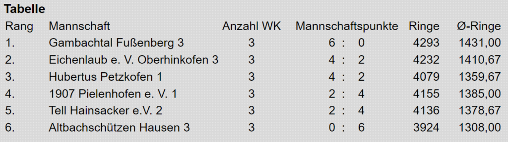 Im Fernwettkampf gegen Pielenhofen holen unsere Schützen der 3. Mannschaft Luftgewehr ihren 3. Saisonsieg. Mit konstanter Mannschaftsleistung bleiben wir damit Tabellenführer