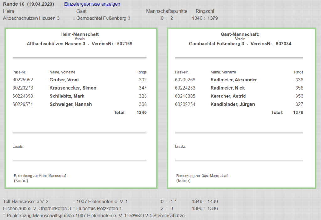 Die 3. Mannschaft Luftgewehr gewinnt 1379 zu 1340 in Hausen und beendet die Gauliga-Saison auf dem 1. Platz.