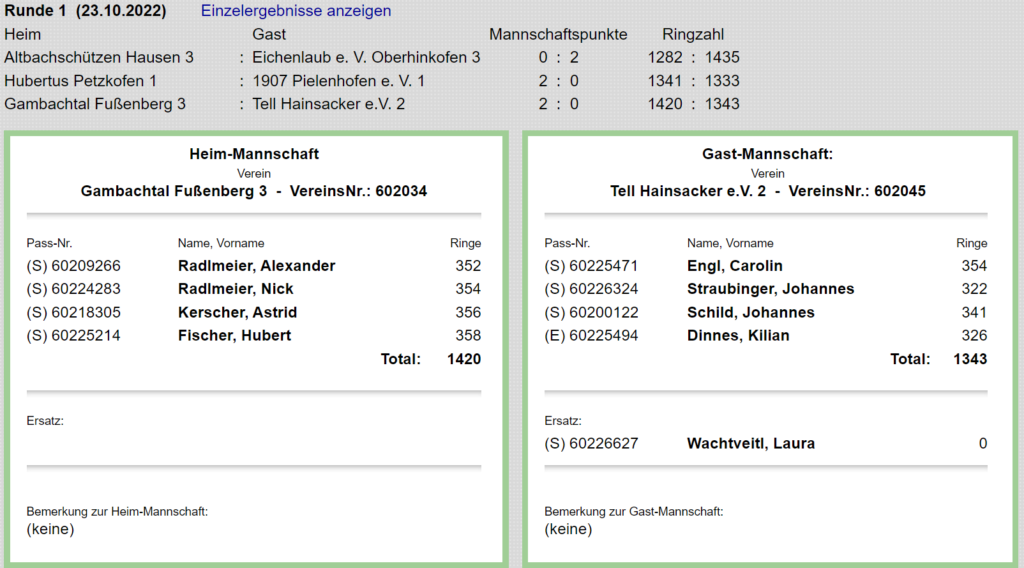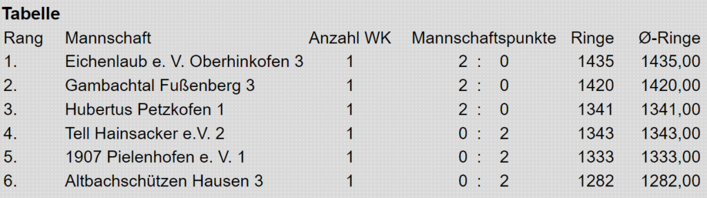 Mit einer geschlossenen Mannschaftsleistung sichert sich die 3. Mannschaft Luftgewehr die ersten 2 Punkte der Saison. Mit 1420 zu 1343 gewinnen wir daheim gegen die 2. Mannschaft aus Hainsacker.