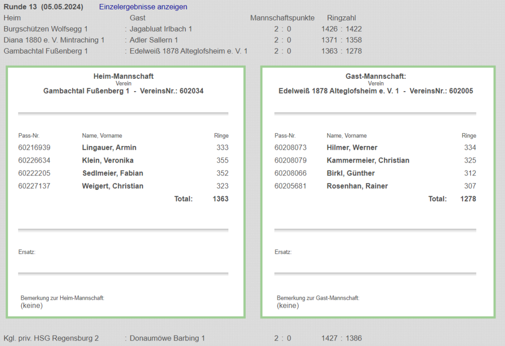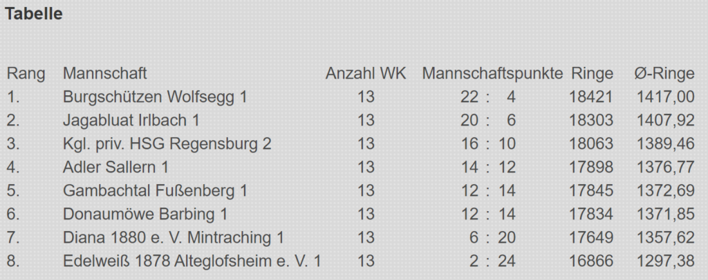 Im vorletzten Durchgang der Luftpistolen-Gauligasaison holen wir nochmal zwei Punkte gegen Alteglofsheim. 1363 zu 1278 heißt es am Ende. In der Tabelle rücken wir wieder vor auf Platz 5.