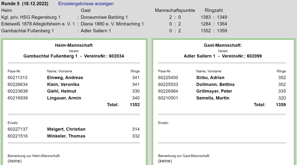 Krankheitsbedingt musste unsere 1. Mannschaft Luftpistole mit Ersatzschützen in das Spitzenduell 1. gegen 2. gehen. Leider war das Glück nicht auf unserer Seite und wir verlieren knapp mit 1352 zu 1359 gegen Sallern. Wir bleiben damit Tabellenzweiter.