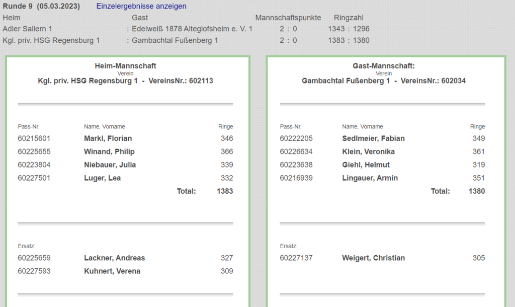 Ganz knapp um 3 Ringe verliert die 1. Mannschaft Luftpistole auswärts bei der HSG Regensburg. 1380 zu 1383 heißt es am Ende. Platz 1 ist nicht mehr erreichbar. Um Platz 2 zu sichern, braucht es zum Abschluss nochmal einen Sieg gegen Sallern.