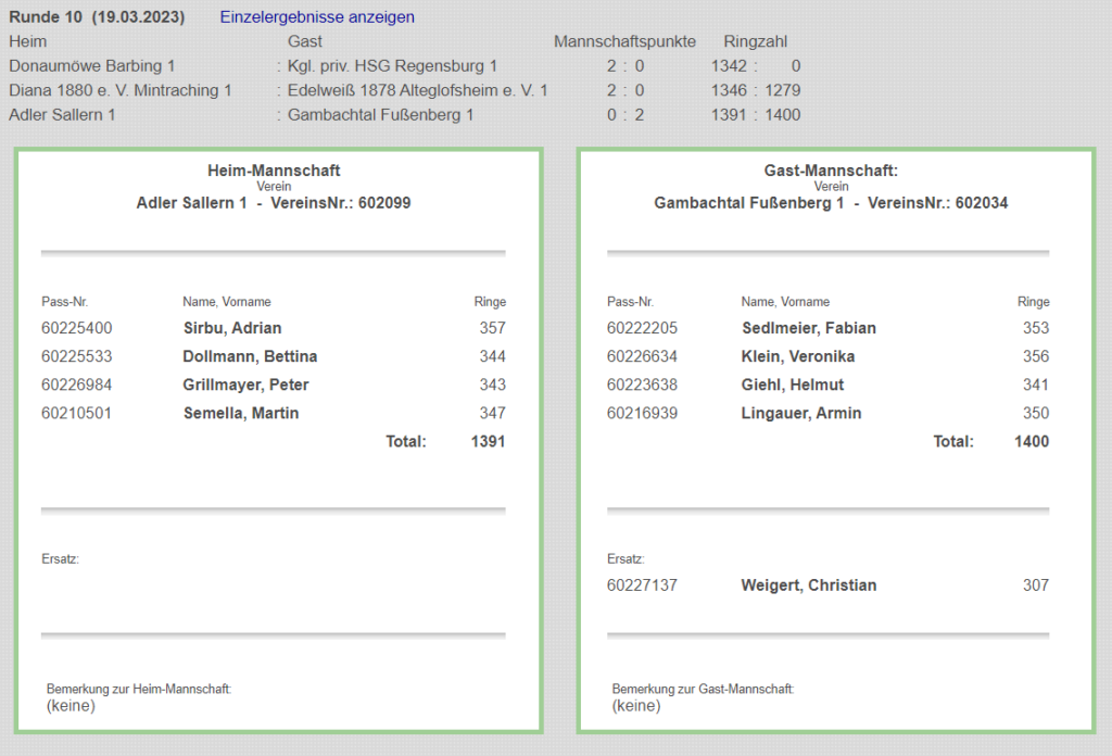 Im letzten Durchgang der Saison gewinnt unsere Luftpistolen-Mannschaft nochmal und knackt mit 1400 Ringen zum zweiten Mal die 1400er Marke. Tabellenführer Sallern kommt auf 1391 Ringe. In der Endtabelle stellt der hervorragende Platz 2 zu buche.