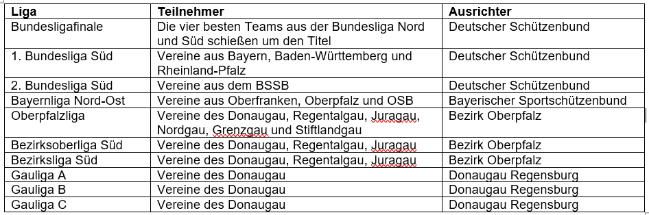 Wie in anderen Sportarten auch, gibt es im Sportschießen einen saisonal stattfindenden Ligabetrieb. Von ganz unten (Gauliga) angefangen, können die teilnehmenden Vereine bis hoch zur 1. Bundesliga aufsteigen. In den unteren Ligen Gauliga und Bezirksliga schießen immer vier Schützen in einer Mannschaft aufgeteilt in (meist) 6er-Gruppen bis 8er-Gruppen mit Vor- und Rückrunde den Auf- bzw. Absteiger aus. Dabei gewinnt die Mannschaft die das höhere Gesamtring-Ergebnis erzielt. Jeder Schütze gibt dabei 40 Schuss in einem vorgegebenen Zeitrahmen ab. Ab der Bezirksoberliga wird in Duellen Schütze-gegen-Schütze geschossen, d.h. der vom Ringdurchschnitt beste Schütze der Mannschaft des jeweiligen Vereins tritt gegen den jeweils besten des gegnerischen Vereins an, der Zweitbesten gegen den Zweitbesten, usw. In diesem Duell holt in 40 Schuss der Schütze mit der höheren erzielten Ringanzahl einen Einzelpunkt für seinen Verein. Bei Punktgleichheit (2:2) entscheidet in der Bezirksoberliga die Gesamtring-Summe der gesamten Mannschaft. In den Ligen oberhalb der Bezirksoberliga, also in der Landesliga (bei uns Oberpfalzliga), Bayernliga, 2. Bundesliga Süd und 1. Bundesliga Süd beträgt die Mannschaftsstärke fünf Schützen und das Gesamtring-Ergebnis ist somit unerheblich (Wettkämpfe enden 5:0, 4:1 oder 3:2). Die Oberpfalz und Bayernliga sind mit jeweils 8 Mannschaften besetzt, ab der 2. Bundesliga finden sich 12 Mannschaften in der Tabelle. Die ersten vier Mannschaften, die am Saisonende die Tabelle der 1. Bundesliga anführen, qualifizieren sich für das Bundesligafinale gegen die ersten vier Teams aus der Bundesliga Nord. Der Sieger ist Deutscher Meister im Sportschießen (gilt für Luftgewehr als auch analog für Luftpistole).