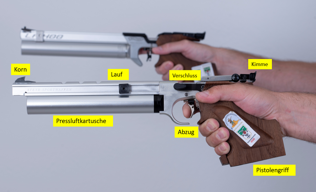 Die Luftpistole ist das Sportgerät unserer Pistolen-Schützen. Die Luftpistole funktioniert, wie das Luftgewehr, mit Druckluft. Dabei wird komprimierte Luft aus der Pressluftkartusche bei Betätigung des Abzugs an das Geschoss im Lauf übertragen.