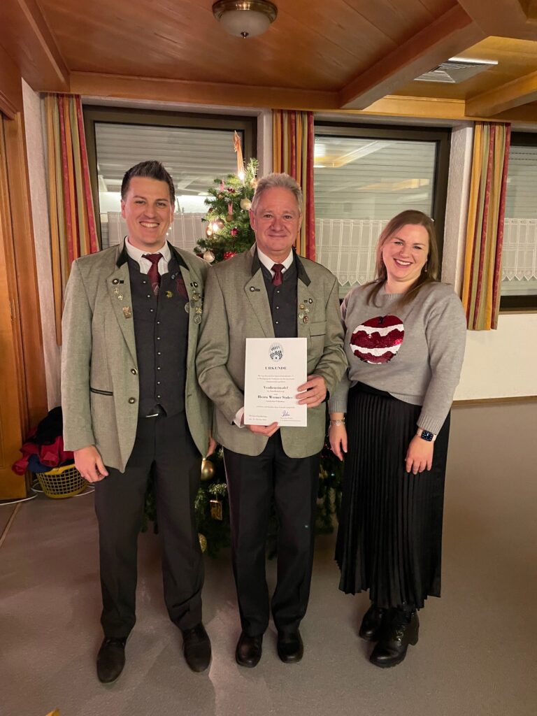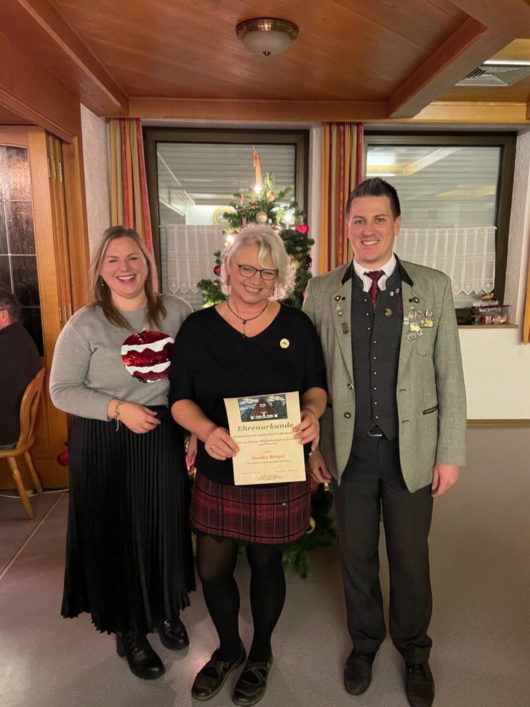 Im Rahmen der Weihnachtsfeier konnte Schützenmeister Andreas Kerscher noch zwei Ehrungen durchführen. Monika Berger, die für 40 Jahre Treue ausgezeichnet wurde, und Werner Stuber, der die silberne Nadel in Anerkennung des Donaugau erhielt.